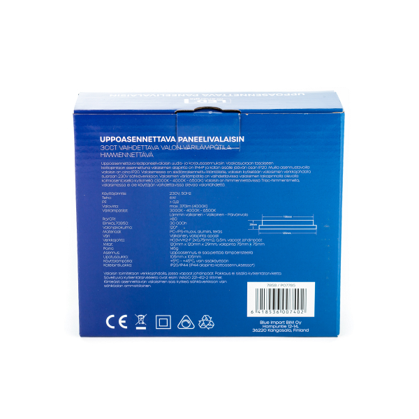 Led Energie neliön muotoinen, uppoasennettava alasvalo, joka sopii kodin kuiviin ja kosteisiin sisätiloihin uudis- ja remonttikohteisiin. Valo on erittäin helppo asentaa, sillä siinä on sisäänrakennettu liitäntälaite ja valaisin kytketään omalla verkkojohdolla suoraan 230V sähköverkkoon. Valosta voi myös valita ennen asennusta värilämpötilaksi joko 3000, 4000 tai 6500 K valon takana olevalla kytkimellä, jolloin siitä saadaan juuri kyseiseen tilaan sopiva tunnelma. Valaisin on himmennettävä Triac-himmentimellä, joten valon tehoa voi säätää käytössä mieleiseksi. Valosta on saatavilla kolmea eri kokoa sekä tehoa, joten tuotevaihtoehdoista voi valita itselleen sopivimman version. Ilmoitettu valoteho 370, 900 tai 1400 lumenia, värilämpötila 3000, 4000 tai 6500 kelviniä.