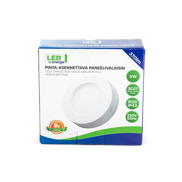 Led Energie pyöreä pinta-asennusvalaisin, joka sopii kodin kuiviin ja kosteisiin sisätiloihin uudis- ja remonttikohteisiin. Valo on helppo asentaa, sillä siinä on sisäänrakennettu liitäntälaite ja valaisin kytketään omalla verkkojohdolla suoraan 230V sähköverkkoon (ei liitintä, vapaat johdinpäät). Valosta voi myös valita ennen asennusta värilämpötilaksi joko 3000, 4000 tai 6500 K valon takana olevalla kytkimellä, jolloin siitä saadaan juuri kyseiseen tilaan sopiva tunnelma. Valaisinta voi himmentää Triac-himmentimellä, minkä ansiosta valon tehoa voi säätää käytössä mieleiseksi. Valosta on saatavilla kolmea eri kokoa sekä tehoa, joten tuotevaihtoehdoista voi valita itselleen sopivimman version. Ilmoitettu valoteho 370, 900 tai 1400 lumenia, värilämpötila 3000, 4000 tai 6500 kelviniä.