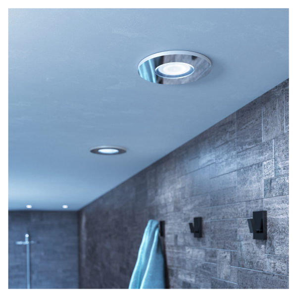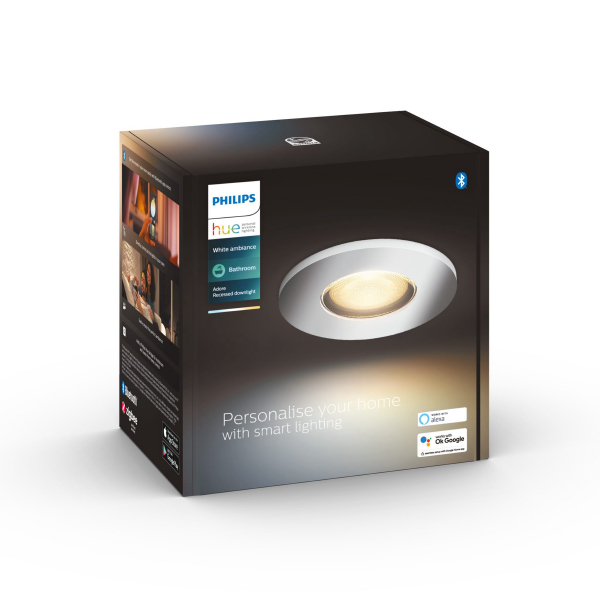 Uppoasennettava, kodin kosteisiin tiloihin sopiva GU10-kantaisella Philips Hue-älypolttimolla varustettu alasvalo, jota voidaan ohjata puhelimella tai Hue Bridgen kautta. Ilmoitettu valoteho 400 lm, värilämpöitla 2200 - 6500 K. IP44-luokitus.