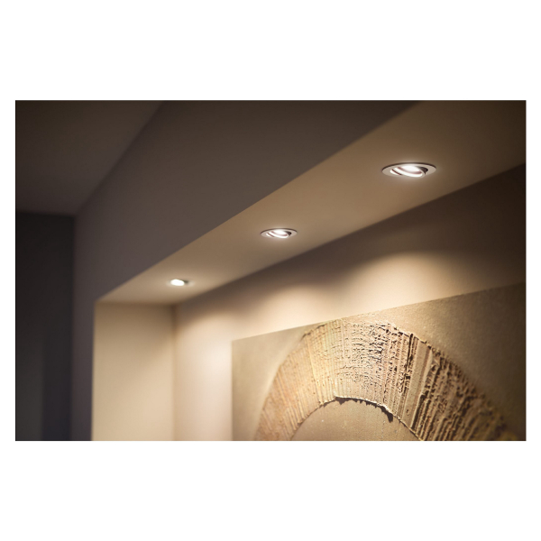 Uppoasennettava, GU10-kantaisella Philips Hue-älypolttimolla varustettu alasvalo, jota voidaan ohjata puhelimella tai Hue Bridgen kautta. Säädettävä spotti, ilmoitettu valoteho 400 lm, värilämpötila 2200 - 6500K. IP20-luokitus.