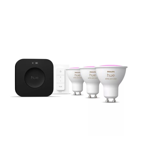 Aloituspakkaus, jolla voidaan luoda perusta kodin älyvalaistukselle. Setti sisältää 3 kpl säädettävällä värillä sekä värilämpötilalla varustettuja GU10-kantaisia Philips Hue-älypolttimoita, kytkimen sekä tekoälyä hyödyntävän Hue Bridge Pron, jotka mahdollistavat kaikkien Hue-polttimoiden ja valaisimien ohjaamisen ja säätämisen yhdestä paikkaa!