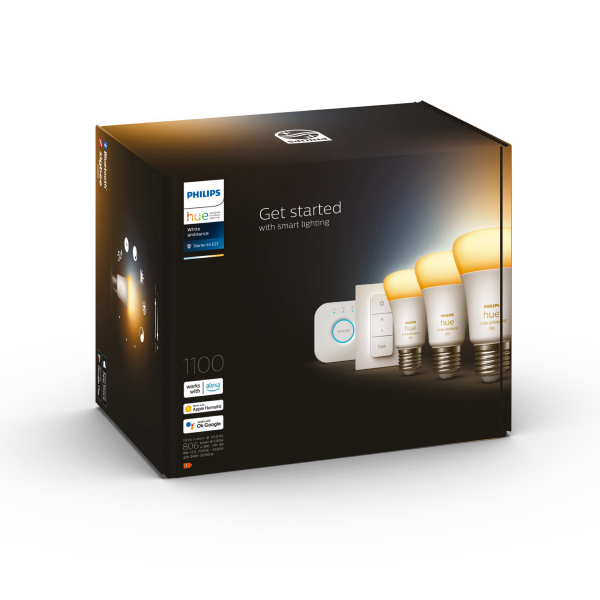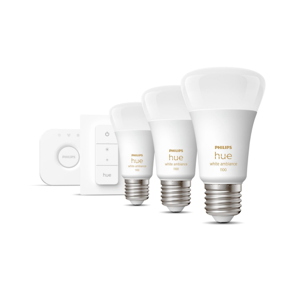 Aloituspakkaus, jolla luot älyvalaistuksen kotiin. Sisältää 3 kpl säädettävällä värilämpötilalla olevia E27-kantaisia älypolttimoita (8W), kytkimen sekä Hue-Bridgen, joilla ohjaat ja säädät kaikkia Hue-älypolttimoita samasta paikasta.