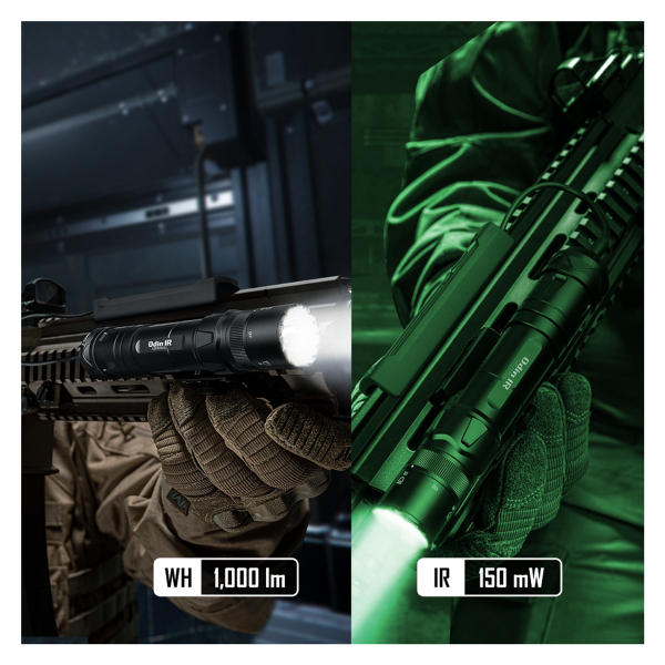 Yhdistetty valkoisen valon ja infrapunavalon tarjoava asevalo vaativaan sotilaskäyttöön. Tiukka valokeila, 1000 lm tai 150 mW maksimiteho! Sopii Picatinny-kiskoihin! IPX8-suojattu.