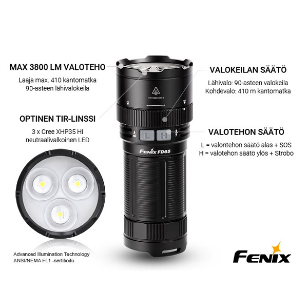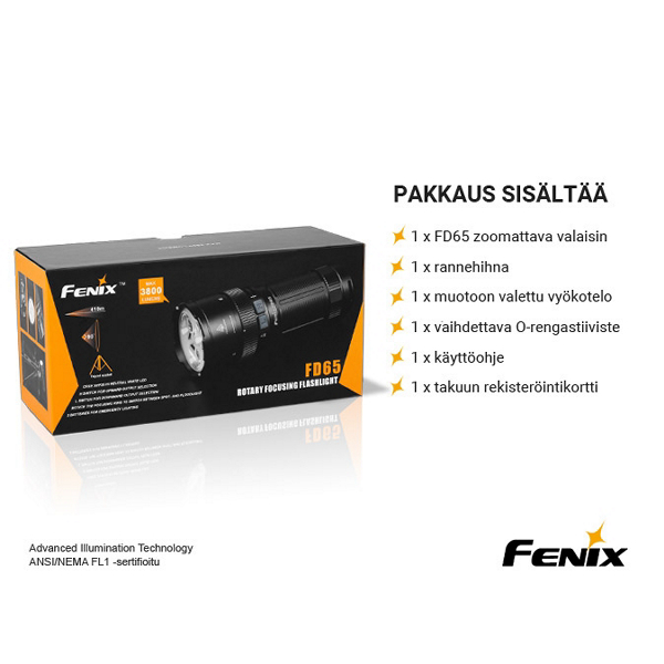 Fenix FD65 on tehokas säädettävällä valokeilalla varustettu 300 lumenin taskulamppu. Valokeilan leveys on jopa huikeat 90-astetta! Tarpeen tulleen FD65 muuntuu myös tehokkaaksi kohdevaloksi jolla valaiset ja löydät kohteen jopa 410 metrin päästä.
