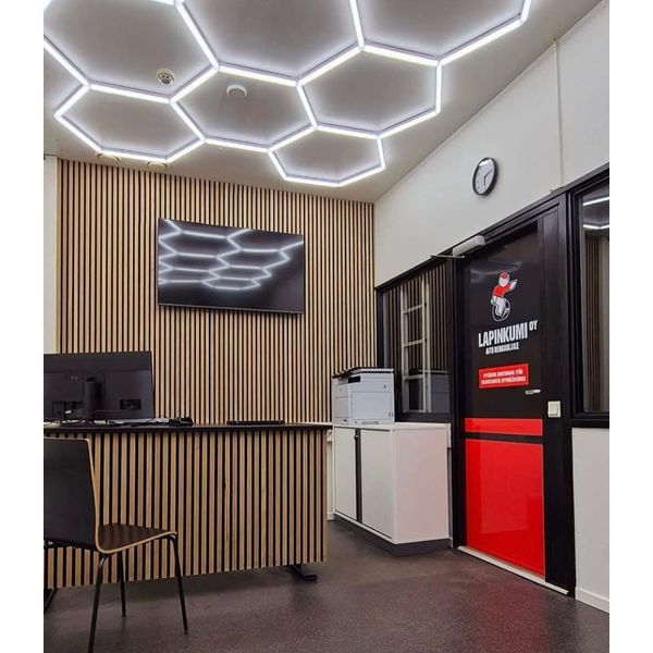 Kirkas, 6500 kelvinin värilämpötilan valaistus tarjoaa modernin, vireystilaa hyvin ylläpitävän sekä värit luonnollisesti toistavan valon. Perinteiseen autotalleista tuttuun 3000 K (kellertävään) valoon verrattuna värit toistuvat siis oikein, eli valkoiset pinnat näyttävät oikeasti valkoisilta jne. Kirkas ja laajalta pinta-alalta muodostuva täysin tasainen valaistus vähentää varjojen syntymistä ja valaisee tilan kauttaaltaan. Hexagon-valot sopivatkin erinomaisesti myös kuntosaleille, kampaamoihin, tatuointistudioihin, toimistoihin ja julkistiloihin. Lisäksi hexagoneja voidaan tietenkin myös hyödyntää kotona uniikin valaistuksen luomiseen vaikkapa työ- tai makuuhuoneessa, käyttökohteita valoille on siis käytännössä rajattomasti!