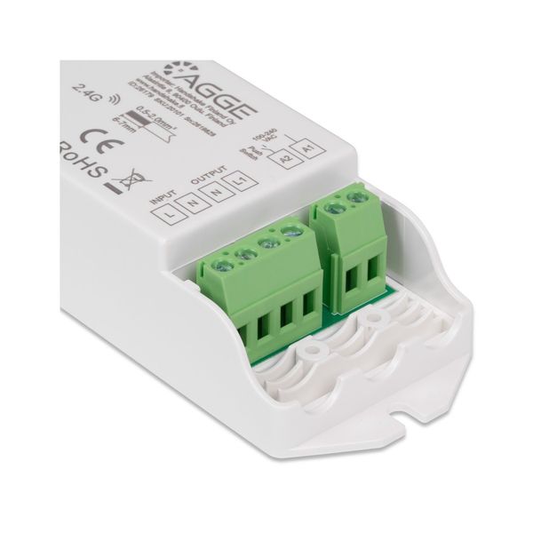 AGGE Push AC Triac Dimmer on Triac-yhteensopiva ohjausyksikkö, joka mahdollistaa TRIAC-himmennettävien (eli käytännössä kaikkien himmennettävien) valaisinten tai kokonaisten valaisinryhmien säädön joko perinteisesti seinäkytkimellä tai vaihtoehtoisesti 2.4 GHZ-taajuudella toimivalla kaukosäätimellä. Ohjausyksikkö liitetään 230V virtaan ennen valaisinta (tai seinäkytkimen ja valaisimen väliin) ja valaisin liitetään puolestaan ohjausyksikköön, jolloin ohjain vastaanottaa komennot joko langattomasti kaukosäätimestä tai kiinteästi seinäkytkimestä ja säätelee valaisinta niiden mukaisesti. Ohjausyksikkö voidaan siis kauko-ohjauksen lisäksi myös liittää perinteisen seinäkytkimen (jousipalautteinen, esim. ABB tai Schneider) perään, joka mahdollistaa kirkkauden säädön seinäkytkimen kautta. Yhden ohjausyksikön taakse voidaan kytkeä max. 300W kuormaa (LED).