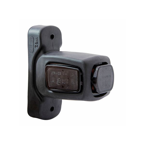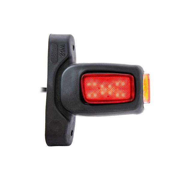 Lyhyellä kumivarrella varustettu, ajoneuvon tai kärryn kylkeen asennettava kolmitoiminen huomio-/äärivalo. Näyttää punaista valoa taakse, oranssia valoa sivulle ja valkoista valoa eteen. Sopii niin 12V- kuin 24V-järjestelmiin.