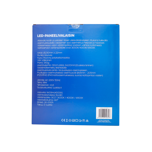 Tyylikäs pinta-asennusvalaisin kotiin tai julkisiin tiloihin. Mukana asennusta helpottava asennusrauta. Ilmoitettu valoteho 1600 lm, säädettävä värilämpötila 3000 - 6500 K. Halkaisija 230 mm.