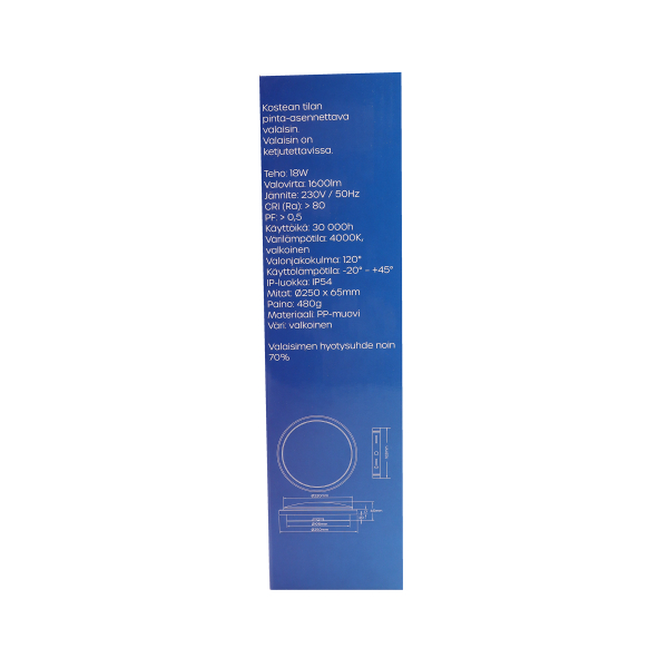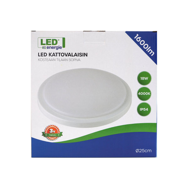 Tyylikäs pinta-asennettava kattovalaisin kodin kuiviin ja kosteisiin tiloihin. Saatavilla kahta eri tehoa ja runkokokoa: 18W / 250 mm tai 24W / 288mm, IP54-luokitus.