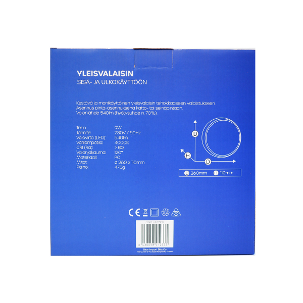Tyylikäs seinään tai kattoon asennettava yleisvalaisin, joka sopii niin sisä- kuin ulkokäyttöönkin. Ilmoitettu valoteho 540 lm, värilämpötila 4000 K.