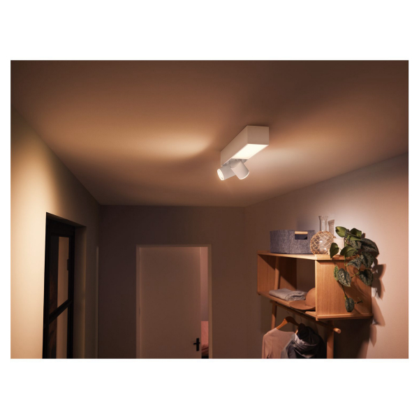 GU10-kantaisilla Philips Hue-älypolttimoilla varustettu kattovalaisin, jota voidaan säätää puhelimella tai Philips Hue Bridgen välityksellä. Ilmoitettu valoteho 1630 lm, värilämpötila 2000 - 6500K. IP20-luokitus.