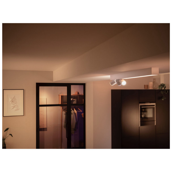 GU10-kantaisilla Philips Hue-älypolttimoilla varustettu kattovalaisin, jota voidaan säätää puhelimella tai Philips Hue Bridgen välityksellä. Ilmoitettu valoteho 3700 lm, värilämpötila 2000 - 6500K. IP20-luokitus.