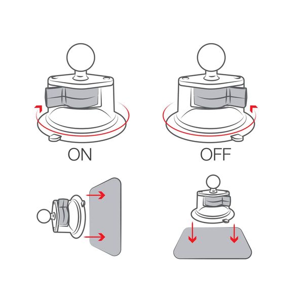 Imukuppikiinnityksellä ja B-koon pallolla varustettu RAM-kiinnike pienehköjen esineiden kiinnittämiseen sileisiin ja tasaisiin pintoihin. Imukupin halkaisija 3.3" (84 mm). B-koon pallo sopii n. 0-1 kg painoisten esineiden kiinnitykseen.