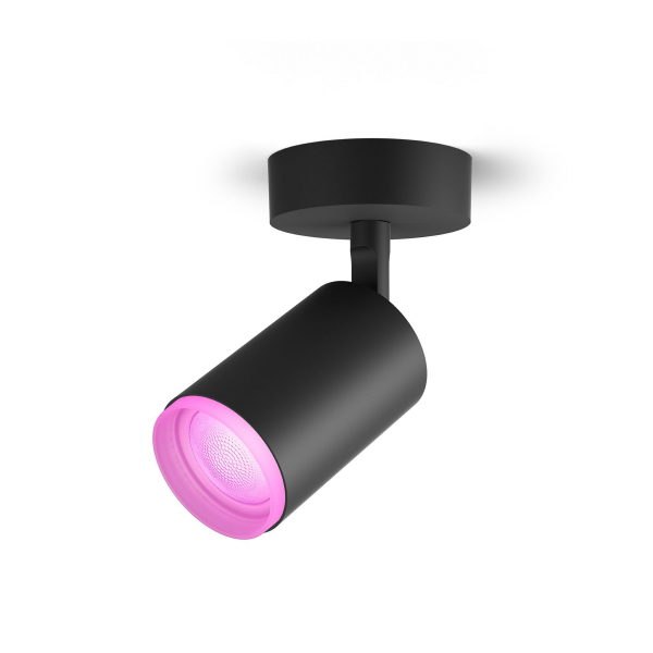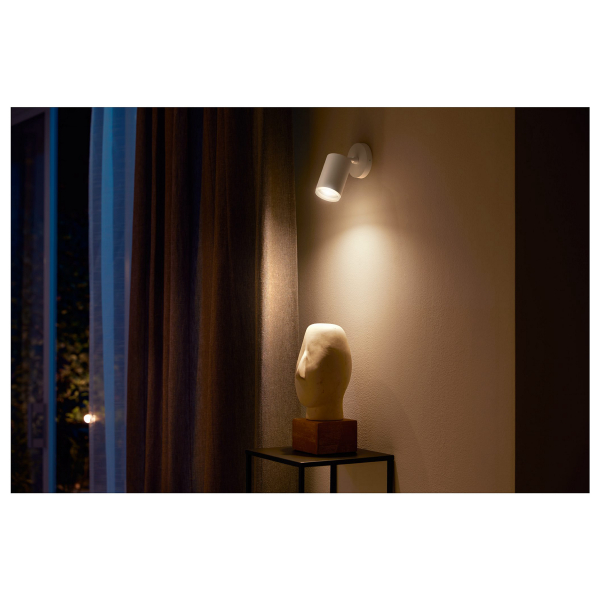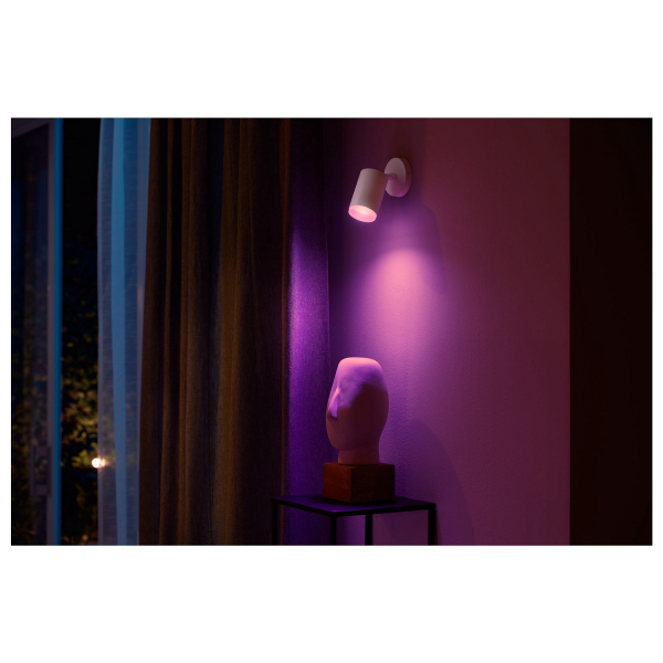 Monikäyttöinen GU10-kantaisella Philips Hue WCA- älypolttimolla varustettu kohdevalaisin, jota voidaan säätää puhelimen tai Philips Hue-sovelluksen kautta. Ilmoitettu valoteho 400 lm, valon väri säädettävissä. IP20-luokitus.