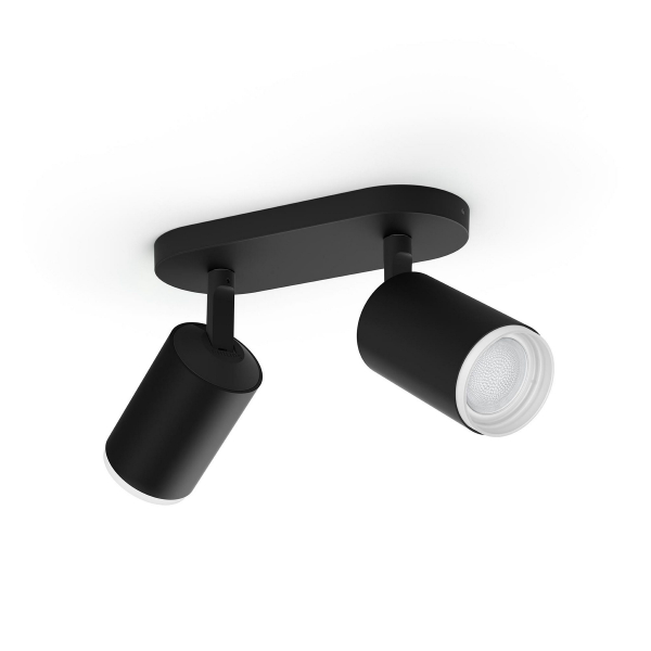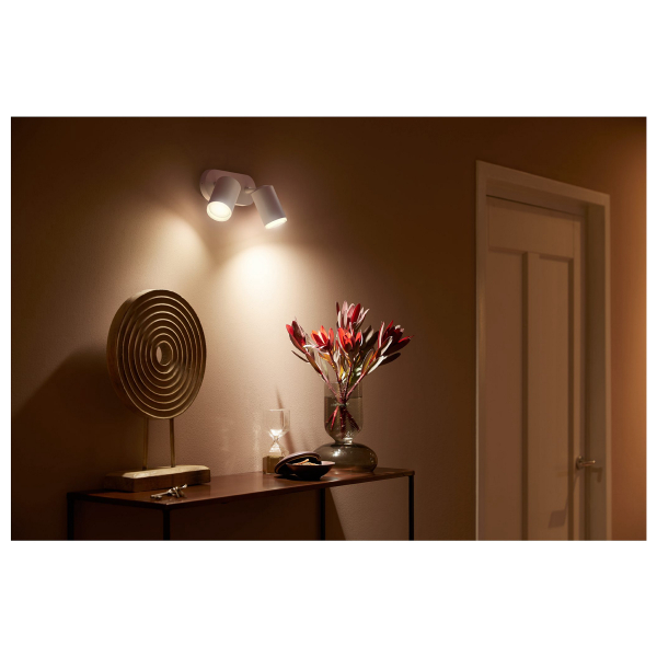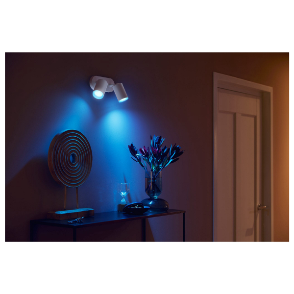 Kahdella GU10-kantaisella Philips Hue WCA-älypolttimolla varustettu kohdevalaisin, jota voidaan ohjata puhelimella tai Philips Hue-sovelluksen kautta. Ilmoitettu valoteho 800 lm, värilämpötila 2000 - 6500 K, väri säädettävissä. IP20-luokitus.