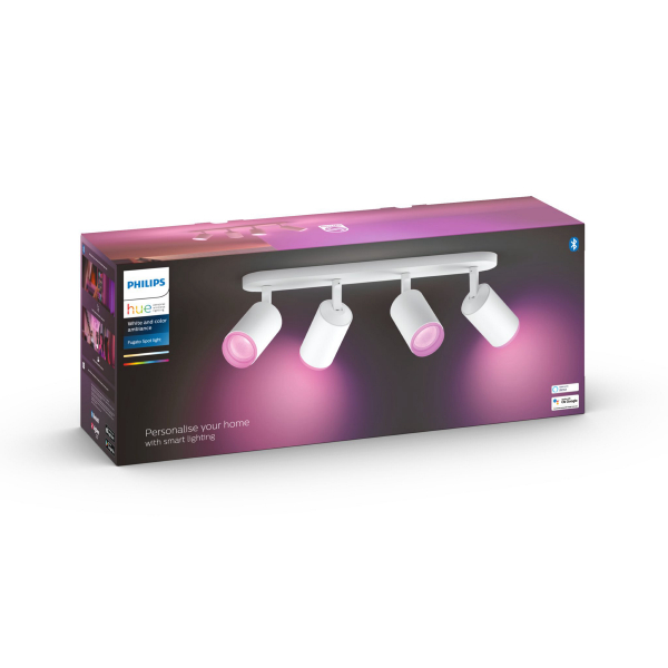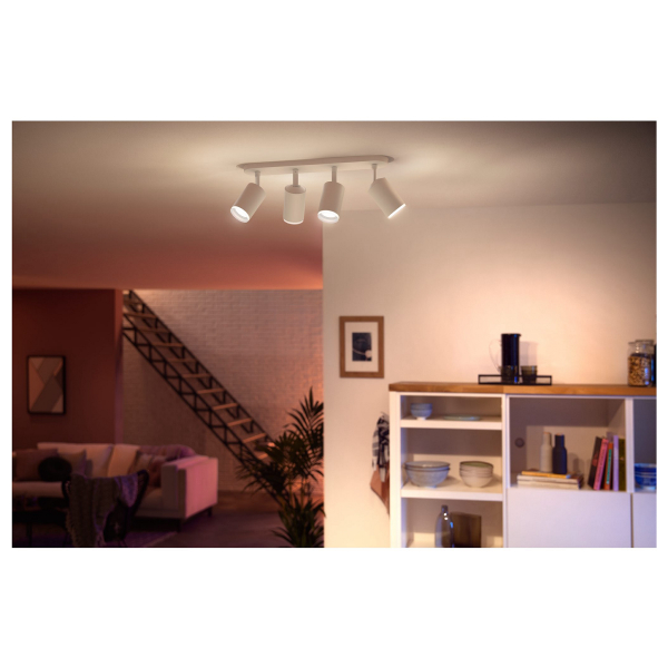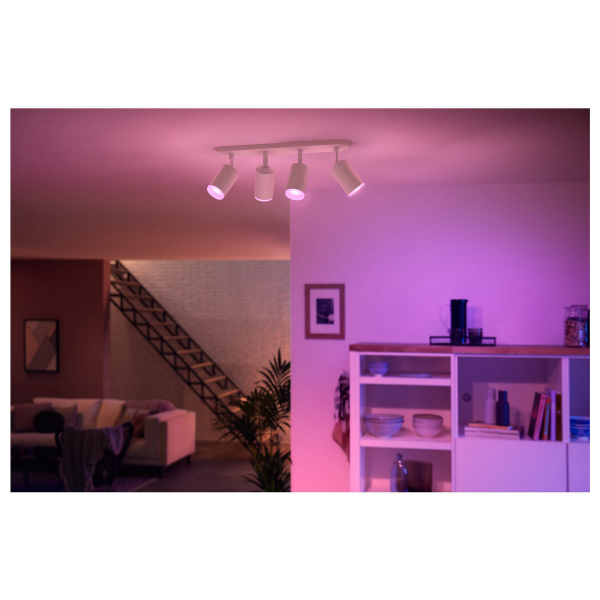 Moderni, neljällä GU10-kantaisella Philips Hue-älypolttimolla varustettu kohdevalaisin, jota voidaan ohjata puhelimella tai Philips Hue-sovelluksella. Ilmoitettu valoteho 1600 lm, värilämpötila 2000 - 6500 K. Valon väri säädettävissä. IP20-luokitus.