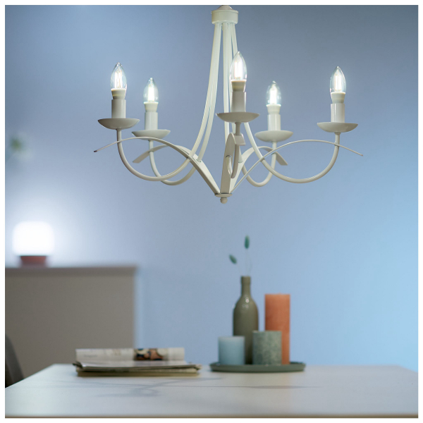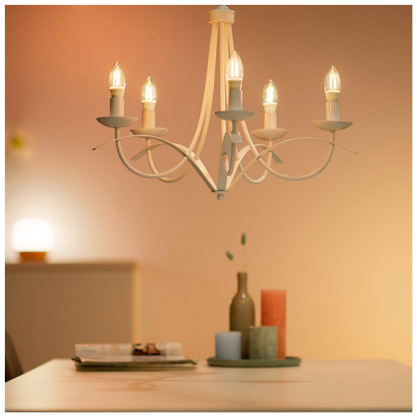 E14-kantainen Filament-älypolttimo, jota voidaan ohjata Wiz-mobiilisovelluksen avulla. Polttimon värilämpötilaa voidaan säätää portaattomasti. Ilmoitettu valoteho 470 lm, värilämpötila 2700 - 6500 K.