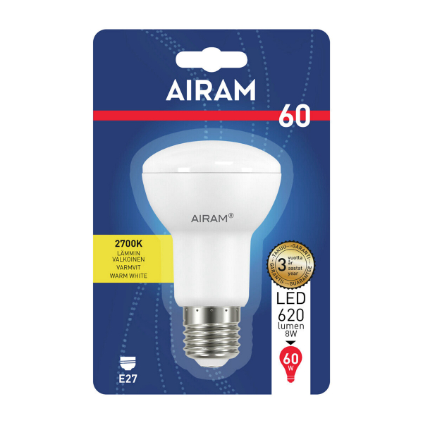 Airam LED-sarjan E27-kantainen, nk. kohdelamppu. Polttimon opaali R63-kohdekupu tuottaa 110° leveän valokeilan, jonka puolesta se sopii erinomaisesti kohdevalaistukseen. Siron muotoilunsa ansiosta polttimo sopii myös avonaisiin valaisimiin. Miellyttävän lämmin, 2700K-värilämpötila. Kolmen vuoden (36 kk) takuu!