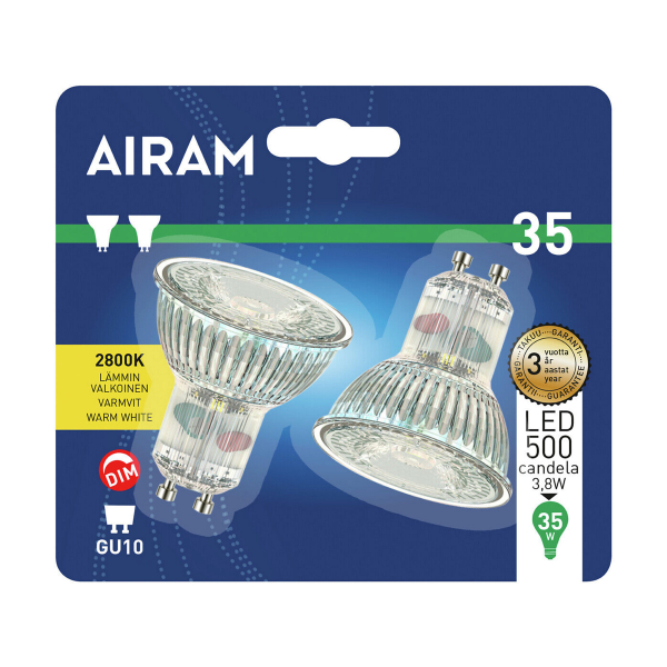 GU10-kantainen, himmennettävä LED-spottivalo kohdevalaisuun. Värilämpötila 2800K, 36° valokuvio. Vastaa n. 35W halogeenin valotehoa. Pakkaus sis. kaksi polttimoa. Kolmen vuoden takuu.