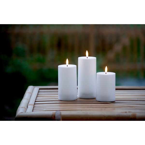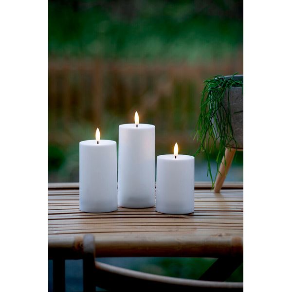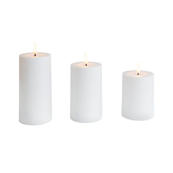 Kaunis led-kynttiläsetti, jota voidaan käyttää sekä sisä- että ulkotiloissa. Luonnollisen näköinen ja lämpimän sävyinen led-liekki tarjoaa tunnelmallisen ja samalla paloturvallisen ratkaisun kynttilöiden ystäville. Jokainen kynttilä toimii kahdella AA-paristolla. Kynttilöiden koot: 12,5 cm, 10 cm ja 7.5 cm. IP44-luokitus.