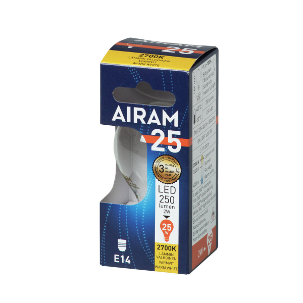 Kirkas pienkupuinen E14 LED-polttimo. Tunnetaan myös yleisimellä filamentti pienkupulamppu. Täysin ympärisäteilevä valonjako, sopii erityisen hyvin esim. plafondeihin ja pöytävalaisimiin asennettavaksi. 2W LED-polttimo vastaa n. 25W hehkulampun valotehoa! Kolmen vuoden (36 kk) takuu!