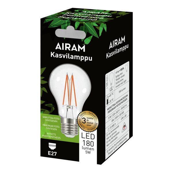 Kirkas vakiokupuinen Airam LED Special -sarjan E27-kantainen erikoislamppu, jonka erityinen spektrijakauma edesauttaa kasvien kasvua. Ns. kasvilampuissa on huomioitu kasvien tarvitsemat valon ominaisuudet, tärkeimpänä punaisen ja sinisen valon alueet, joita korostamalla kasvit sekä voimistuvat että saavuttavat hyvin pituutta. Ei lämmitä kasveja. Energiatehokkuusluokka A+.