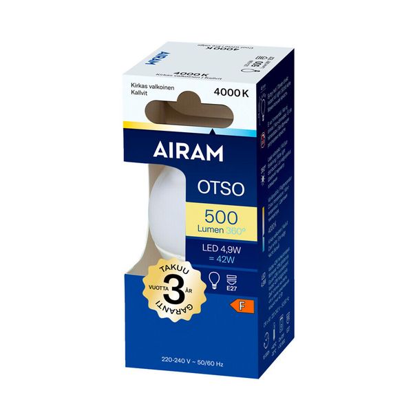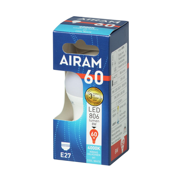 Airam muovisella rungolla varustettu E27-kantainen LED-polttimo. Tunnetaan myös yleisnimellä pienkupulamppu. Opaali valonlähde antaa häikäisemättömän valon, ja siron muotoilunsa puolesta polttimo sopii myös avonaisiin valaisimiin. Kolmen vuoden (36 kk) takuu!