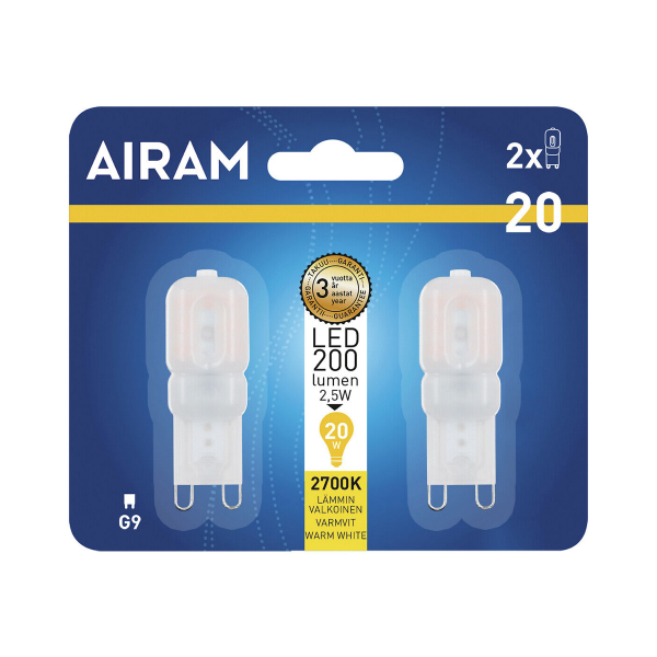 G9-kantainen nk. pienoislamppu. Värilämpötila 2700K. Vastaa n. 20W halogeenin valotehoa. Kolmen vuoden takuu. Kahden kappaleen pakkaus!