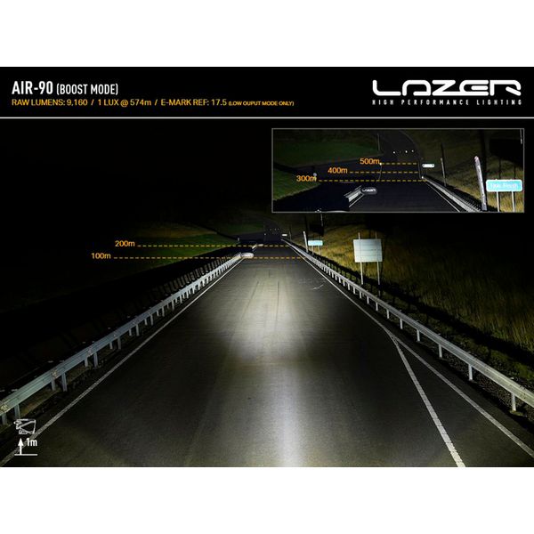 Lazer AIR-90 on R65XA1-hyväksytyllä varoitusvalolla varustettu versio Lazerin upeaa designia sekä erinomaista suorituskykyä tarjoavasta AIR-90-lisävalosta. AIR-90 Beacon on erityisesti raskaan kaluston tarpeisiin suunniteltu pieni, näyttävä ja tehokas lisävalo, josta löytyy oranssin varoitusvalon lisäksi kaksi eri tehotilaa, oranssi ja valkoinen parkkivalo sekä laadukas yhdistelmävalokeila. Valoteholtaan tämä paneeli vastaa käytännössä valmistajansa Triple-R 1000 -lisävaloa, joka on omassa kokoluokassaan yksi markkinoiden suorituskykyisimmistä lisävaloista. AIR-90 tarjoaa tieliikenteen ulkopuolelle tarkoitetussa E-Boost-tilassa valmistajan mukaan hurjan 9160 lumenin valotehon sekä jopa 574 metriin (1 lux) kantavan valokeilan. Paneelin tehokkaasti heijastavat, tyhjiömetalloidut heijastinpinnat yhdistettynä suorituskykyisiin ledeihin aikaansaavat miellyttävän yhdistelmävalokuvion, joka valaisee sekä kauas eteen että leveästi tien reunoille. Raskaan kaluston käyttöön optimoitu valokeila aukeaa täydellisesti myös korkealle asennettuna, ja erillisen majakkatoiminnon ansiosta tämä lisävalopaneeli on täydellinen ratkaisu kaikille ajoneuvoille, jotka ajavat sekä maanteillä että työmailla ja maastossa.