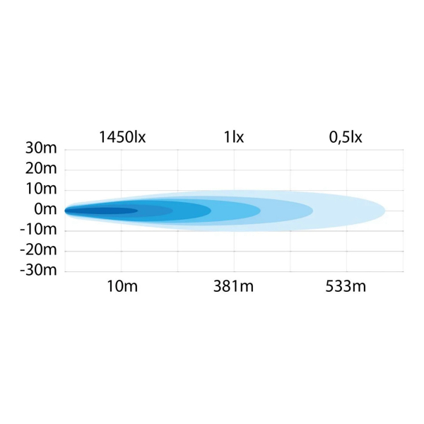 Kaksivärisellä parkkivalolla varustettu järeä lisävalo, jonka äärimmäisen spottimainen valokeila tarjoaa 381 metrin kantaman (1 lux), sekä 1948 lumenin valotehon. Tyylikäs tumma profiili ja optiikka sopii autoon kuin autoon!