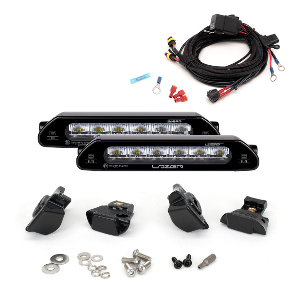 Paketin mukana tulee kaksi Lazer Linear 6 Elite -lisävalopaneelia, kaikki asennukseen tarvittavat kiinnikkeet ja ruuvit, valmis johtosarja sekä asennus- ja kytkentäohjeet. Etusäleikköön tulevat kiinnikkeet ovat valmistettu erittäin kestävästä ASA-materiaalista (Acrylonitrile Styrene Acrylate), joka on erityisesti tunnettu sen lujuudesta sekä loistavasta kestävyydestä UV-säteilyä vastaan. Kiinnikkeet ovat myös täysin sään- ja kemikaalinkestäviä, mikä varmistaa asennuksen siistinä pysymisen vuosi toisensa jälkeen.