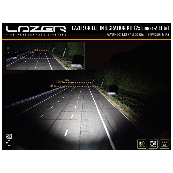 Lazer Linear 6 Elite on erittäin suositun lisävalosarjan pienin malli - pituutta valaisimesta löytyy 220 mm ja painoa ainoastaan 495 grammaa. Se on rakenteeltaan erittäin siro ja matalaprofiilinen, jonka vuoksi se on kuin kotonaan huomaamattomissa puskuriasennuksissa. Pieneksi paneeliksi Linear 6 Elite on poikkeuksellisen tehokas. Se tarjoaa valmistajan mukaan jopa 4050 lumenin valotehon per valaisin, eli paketin kahdella valaisimella saavutetaan jopa 8100 lumenin valoteho! Tarkasti pystysuunnassa rajattu valokuvio ei tuota häiritsevää "valopalloa" ajoneuvon eteen, vaan Linear 6 Elite muodostaa erittäin miellyttävän yhdistelmäkuvion, joka valaisee sekä tehokkaasti pitkälle eteenpäin että leveähkösti tien reunoille. Valmistajan mittaama kantama kahdelle valaisimelle on 398 metriä @ 1 lux.