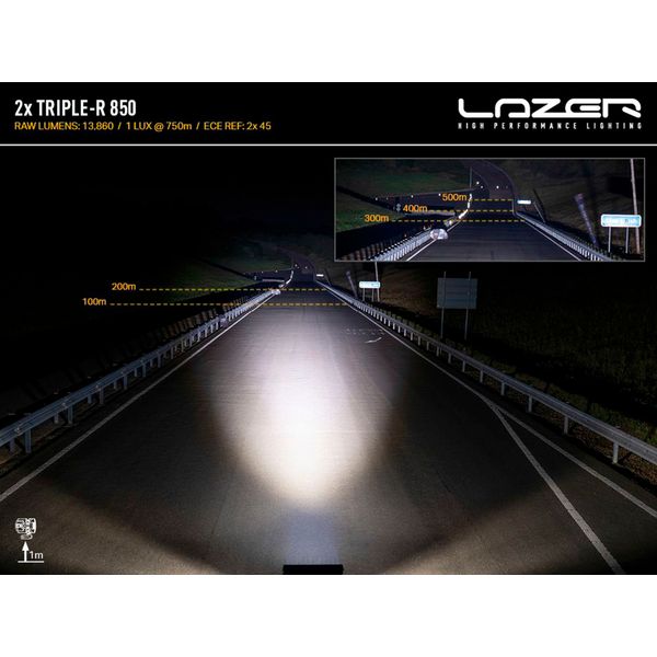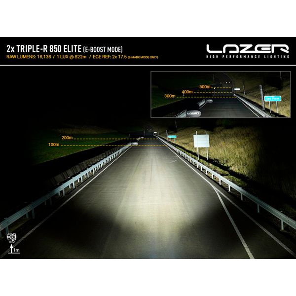 Lazer Triple-R 850 Elite Gen2 on tehokas, kompaktisarjaa edustava lisävalopaneeli, josta löytyy patentoitu E-boost toiminto. Valaisimen päivitetyt LED- ja heijastintekniikka tarjoavat entistä paremman valotehon, pidemmän kantaman sekä leveämmän valokuvion. Valaisin sopii loistavasti sekä normaaliin tieiikenteeseen (e-hyväksytty tila) että tieliikenteen ulkopuolelle esim. kilpa-ajoneuvoihin (E-Boost-mode). E-Boost-tilassa valaisin tarjoaa huiman 8068 lm valotehon sekä 581 m (1 lux) kantaman, joka on tämän kokoluokan valaisimelle iso saavutus. Lisäksi paneelin hienovaraiset muotoilupäivitykset saavat valaisimen sulautumaan entistä paremmin myös nykyaikaisten, esteettisesti motoiltujen autojen keulaan. Tässä valaisimessa on myös patentoitu E-BOOST -teknologia, joka antaa mahdollisuuden käyttää valaisinta vähemmällä teholla tieliikenteessä (E9) ja suuremmalla teholla normaalin tieliikenteen ulkopuolella.