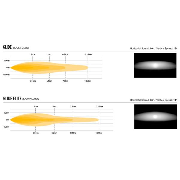 Lazer Glide Elite on matalalla profiililla, hurjalla suorituskyvyllä sekä laadukkaalla yhdistelmävalokuviolla varustettu uuden aikakauden lisävalopaneeli, jonka ainutlaatuinen muotoilu sekä poikkeuksellinen linssirakenne tuovat pöytään näyttävyyttä, jollaista ei ole lisävalomarkkinoilla aiemmin tavattu. Ainutlaatuisen muotokielen lisäksi Glide Elite on varustettu mm. neutraalilla 5000K värilämpötilalla ja kahdella eri tehotilalla, jotka mahdollistavat sekä tieliikenteeseen tarkoitetun tehotilan että kaiken valotehon vapauttavan tehotilan käyttämisen. Rajoittamattomassa E-Boost-tilassa valaisimen tehokkaat ledit tuottavat valmistajan mukaan 8012 lumenin valotehon, ja kun tällainen suorituskyky yhdistetään voimakkaasti heijastaviin tyhjiömetalloituihin heijastinpintoihin, saadaan aikaan jopa 624 metriin (1 lux) kantavan yhdistelmävalokeila, joka valaisee sekä kauas eteen että leveästi tien laidoille.