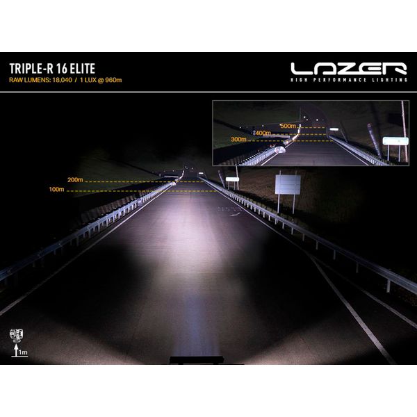 Lazer Triple-R 16 Elite Gen2 on viimeisintä LED- ja heijastintekniikkaa hyödyntävä, tyrmäävän tehokas lisävalopaneeli Off-Road-käyttöön. Suuren valotehon vuoksi valaisin ei ole tieliikennekäyttöön hyväksytty, vaan se on tarkoitettu esim. ralliautoihin tai muihin asennuskohteisiin, joita käytetään normaalin tieliikenteen ulkopuolella. Valaisin tarjoaa huiman 18040 lm valotehon ja 960 m (1 lux) kantaman, joka on tämän kokoluokan valaisimelle kaikkea muuta kuin itsestäänselvyys. Paranneltu, tiukemmin pystysuunnassa rajattu valokuvio leikkaa turhan valon pois. Pienempi pystysuuntainen leviäminen mahdollistaa valon suuntaamista myös tien reunoille. Valaisimen runko ja kiinnikkeet ovat entistäkin paremmin suunnitellut - niiden päivitetty muotoiltu vähentää ilmanvastuksesta aiheutuvaa meteliä, joka saattaa olla suuremmilla paneeleilla ongelmana. Täten paneeli toimii paremmin myös kattoasennuksissa! Alumiinirunko, elinikäisellä takuulla (rikkoutumista vastaan) varustettu polykarbonaattilinssi sekä edistyksellinen Gore-Tex -tiiviste (joka mahdollistaa kosteuden poistumisen valaisimen sisältä) varmistavat, ettei valaisin petä kovimmassakaan käytössä. Lisäksi rikkoutumaton polykarbonaattilinssi on käsitelty erikoislakalla, joka vähentää linssin naarmuuntumista.