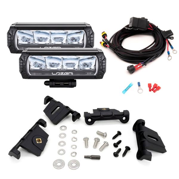 Paketin mukana tulee kaksi Lazer Triple-R 750 Elite GEN2 -lisävalopaneelia, kaikki asennukseen tarvittavat kiinnikkeet ja ruuvit, valmis johtosarja sekä asennus- ja kytkentäohjeet. Etusäleikköön tulevat kiinnikkeet ovat valmistettu erittäin kestävästä ASA-materiaalista (Acrylonitrile Styrene Acrylate), joka on erityisesti tunnettu sen lujuudesta sekä loistavasta kestävyydestä UV-säteilyä vastaan. Kiinnikkeet ovat myös täysin sään- ja kemikaalinkestäviä, mikä varmistaa asennuksen siistinä pysymisen vuosi toisensa jälkeen.