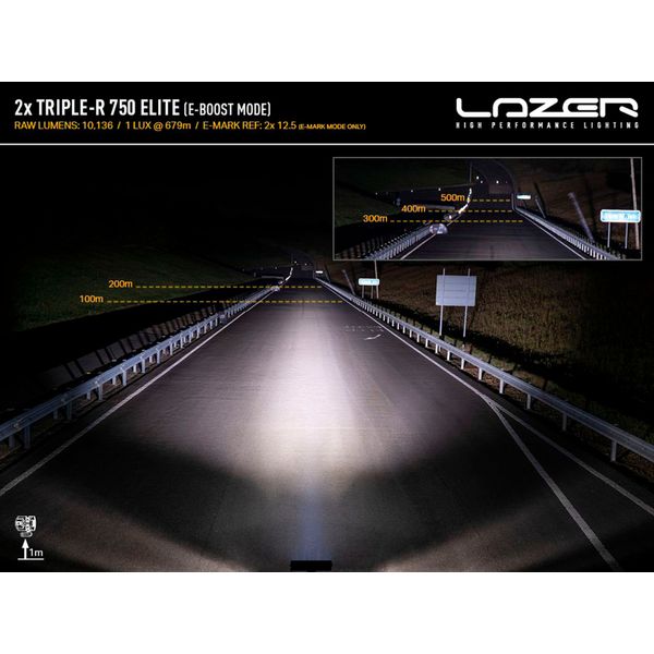 Lazer Triple-R 750 Elite Gen2 on tehokas, kompaktisarjaa edustava lisävalopaneeli, josta löytyy patentoitu E-boost toiminto. Valaisimen päivitetyt LED- ja heijastintekniikka tarjoavat entistä paremman valotehon, pidemmän kantaman sekä leveämmän valokuvion. Valaisin sopii loistavasti sekä normaaliin tieiikenteeseen että tieliikenteen ulkopuolelle esim. kilpa-ajoneuvoihin. E-Boost-tilassa valaisin tarjoaa huiman 5068 lm valotehon sekä 517 m (1 lux) kantaman, joka on tämän kokoluokan valaisimelle iso saavutus. Lisäksi paneelin hienovaraiset muotoilupäivitykset saavat valaisimen sulautumaan entistä paremmin myös nykyaikaisten, esteettisesti motoiltujen autojen keulaan. Tässä valaisimessa on myös patentoitu E-BOOST -teknologia, joka antaa mahdollisuuden käyttää valaisinta vähemmällä teholla tieliikenteessä (E9) ja suuremmalla teholla normaalin tieliikenteen ulkopuolella.