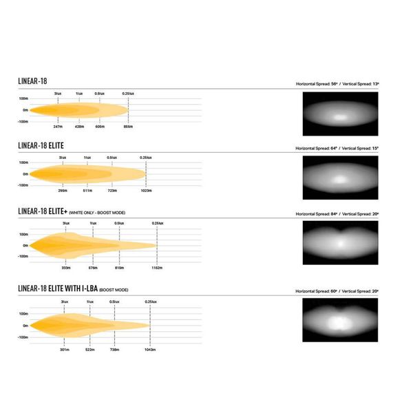 Lazer Linear 18 Elite i-LBA on todella siro, mutta järisyttävän tehokas ja monipuolinen LED-lisävalopaneeli. Valaisimen 48:sta ledistä osa on suunnattu hieman kapeammalla keilalla suoraan eteenpäin, jolla Linear-18 Elite i-LBA-valolle on saatu vaikuttava 522 m kantama (@1 lux). Osa ledeistä taas on suunnattu todella leveällä, sivuttaissuunnassa jopa 60° valaisevalla keilalla valaisemaan tietä ja tien reunoja lyhyille ja keskipitkille matkoille. Optimaalinen valokeila yhdistettynä valtavaan, jopa 18 000 lm valotehoon takavat, että valon suorituskyky riittää käytössä kuin käytössä.