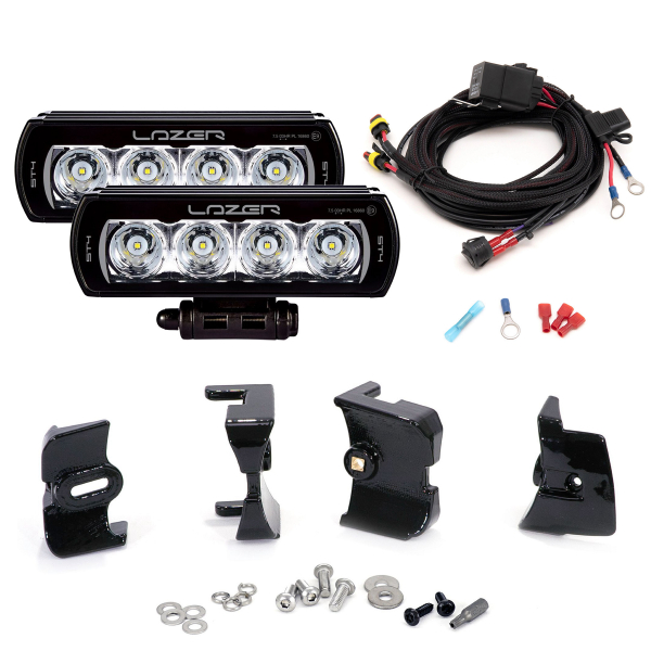 Paketin mukana tulee kaksi Lazer ST4 Evolution -lisävalopaneelia, kaikki asennukseen tarvittavat kiinnikkeet ja ruuvit, valmis johtosarja sekä asennus- ja kytkentäohjeet. Etusäleikköön tulevat kiinnikkeet ovat valmistettu erittäin kestävästä ASA-materiaalista (Acrylonitrile Styrene Acrylate), joka on erityisesti tunnettu sen lujuudesta sekä loistavasta kestävyydestä UV-säteilyä vastaan. Kiinnikkeet ovat myös täysin sään- ja kemikaalinkestäviä, mikä varmistaa asennuksen siistinä pysymisen vuosi toisensa jälkeen.