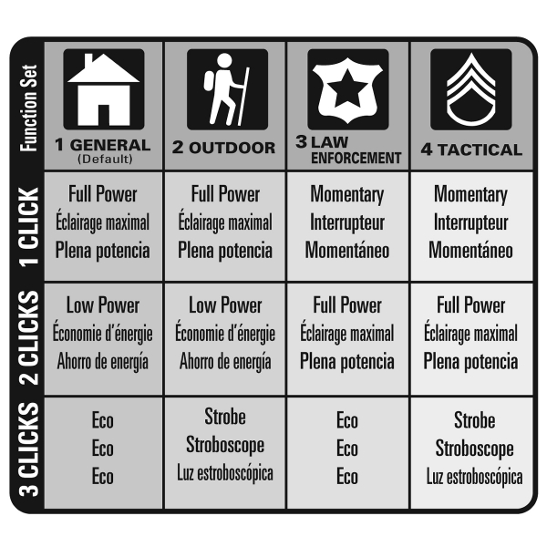 General -yleiskäyttöasento on valaisimessa esiasetettuna, ja sen toiminnot ANSI FL1 standardin mukaisesti: