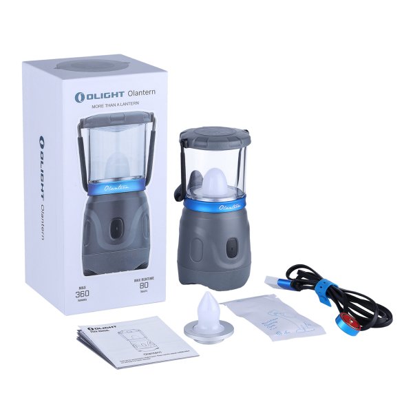 Olight Olantern on erittäin tyylikäs ja ja kirkas LED-lyhty esimerkiksi mökille, retkille, vaelluksille tai vaikka lapsille leikkiin. Pienikokoinen (136 x 66 mm), mutta tehokas lyhty riittää valaisemaan mukavasti esimerkiksi teltan, saunan tai vaikka kuistin. Lyhty valaisee täydet 360° ympäriinsä, ja 360 lm maksimivaloteho riittää erittäin moneen käyttöön. Lyhty toimitetaan kahdella erilaisella valaisinosalla: toisesta löytyy 3 tasaisesti palavaa tehotilaa, ja toisesta, liekin mallisesta löytyy kynttilän liekkiä matkiva oranssi, hieman aaltoileva valoteho, joka toimii 1 lm valotehollaan loistavasti esim. yövalona tai tunnelman luojana.