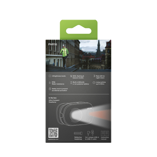 GP Xplor PHR 16 on kompakti ja käyttäjäystävällinen, USB-C ladattava otsalamppu. PHR 16 erottuu joukosta kevyellä painollaan (44 g) ja monipuolisilla toiminnoillaan, mikä tekee siitä joustavan kumppanin tilanteeseen kuin tilanteeseen. Se sopii hyvin kaikkiin keveisiin ulkoaktiviteetteihin, erityisesti kaupunkiympäristössä, jossa liikkuminen liikenteen ja ihmisten seassa on haastavaa. Valaisimesta löytyy perinteisen valkoisen valon lisäksi myös hämäränäön säilyttävä punavalo, mikä on erittäin hyödyllinen esim. kartanluvussa. Valkoisesta valosta löytyy neljä kirkkausasetusta, punavalosta kaksi + vilkkutoiminto. Lisäksi valaisimessa on SOS ja Beacon -toiminnot, joita voidaan käyttää signaali- tai merkkivalona esim. hätätilanteissa. Valmistajan ilmoittama, kokoisekseen vaikuttava 300 lumenin maksimiteho on riittävä yleisimpiin toimiin niin kotona kuin ulkoilussa. Maksimiteholla valokeila kantaa valmistajan mukaan 50 metrin päähän. Kaiken kaikkiaan GP Xplor PHR 16 on luotettava, monipuolinen ja kestävä tuote, mikä täyttää kaikki peruskäyttäjän tarpeet.