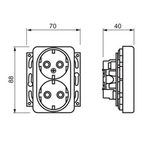Keskiölevyllä varustettu ABB JUSSI-sarjan 2-osainen uppoasennettava pistorasia. Liittimet kutakin kosketinta kohden, ja niihin voidaan kytkeä max. 4 johtoa (haaroitusmahdollisuus). Liittimet on hyväksytty ML- ja MK-johtimille. IP21-luokitus.
