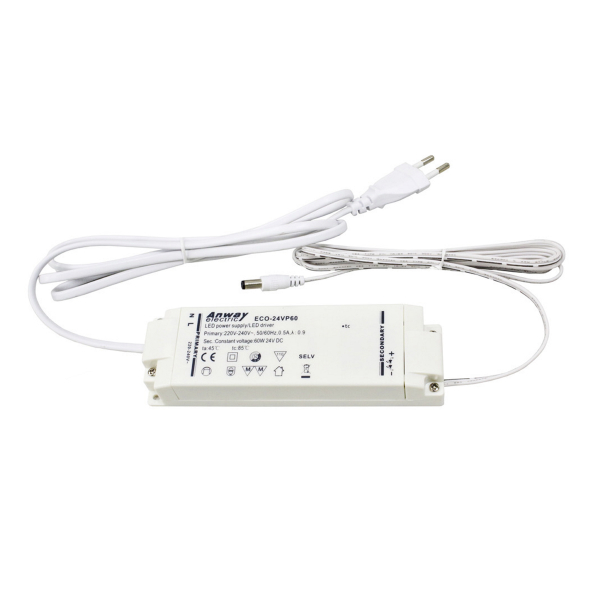Airam Linear-sarjan valaisimille sopiva, pistorasiaan kytkettävä 24V muuntaja. Saatavilla 3 eri tehoa (40, 60 ja 80W). Soveltuu sisätiloihin, suojausluokitus IP20.