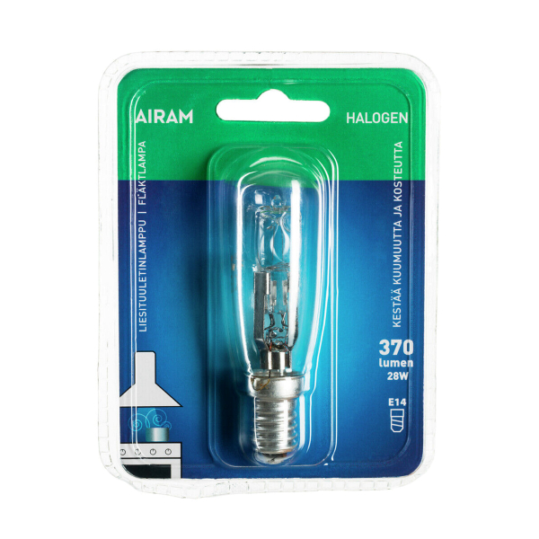 E14-kantainen halogeenipolttimo, mikä on kehitetty kuumia ja kosteita käyttöolosuhteita varten. Soveltuu erityisen hyvin liesituulettimeen asennettavaksi. Teho 28 W.