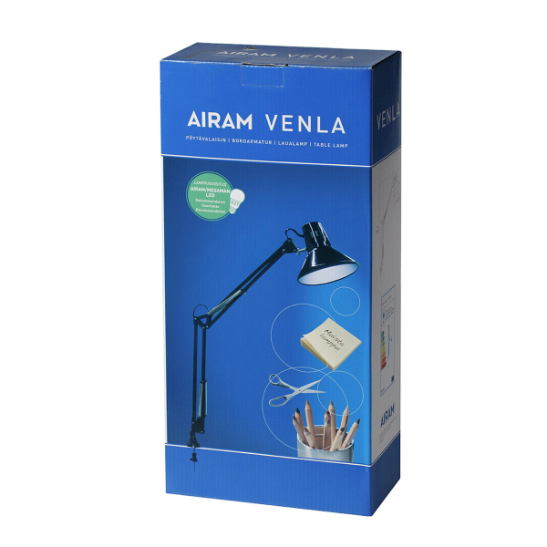 Airam Venla on perinteinen pöytävalaisin, joka on hyvä valinta esimerkiksi toimistoon, kotitoimistoon tai koululaisen työskentelyvaloksi. Raikkaat trendivärit tuovat särmää sisustukseen. Kaksiosainen nivelletty varsi ja kääntyvä varjostin antavat monipuoliset säätömahdollisuudet, jolloin häikäisyä saadaan ehkäistyä ja työskentelyergonomiaa lisättyä. Valaisin kiinnitetään pöydän reunaan ja näin ollen se ei vie työtilaa pöydältä. Polttimon kanta E27 (max. 40 W), ei sisälly pakkaukseen.