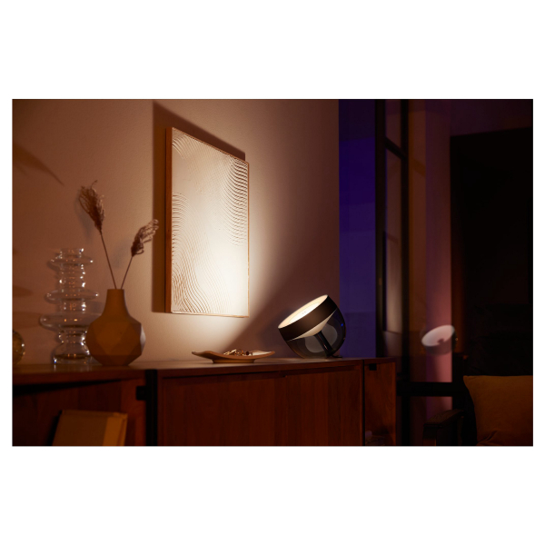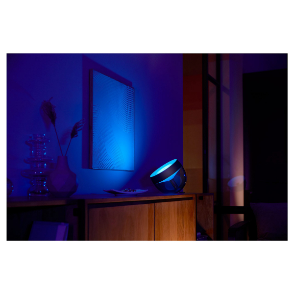 Philips Hue Iris on moderni pöytävalaisin, jota voidaan ohjata Philips Hue-sovelluksen kautta. Valaisin soveltuu hyvin kodin kaikkien huoneiden yleis- ja tunnelmavalaistukseen, ja kompaktin kokonsa ansiosta se voidaan sijoittaa käytännössä mihin tahansa, esimerkiksi pöydälle valaisemaan tai värjäämään seiniä, yöpöydälle lempeäksi yövaloksi tai television viereen tehostamaan viihdekokemusta. Vain mielikuvitus on rajana tämän valaisimen kanssa! Iris-valaisin voidaan myös kohdistaa juuri haluttuun suuntaan, mikä tekee siitä entistä monipuolisemman. Valaisimella voidaan luoda sekä kirkasta että värikästä valoa, ja sitä voidaan himmentää portaattomasti Philips Hue-sovelluksen kautta, kun se on liitetty Philips Hue-älyvalojärjestelmään.