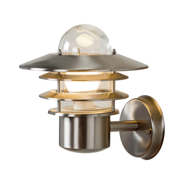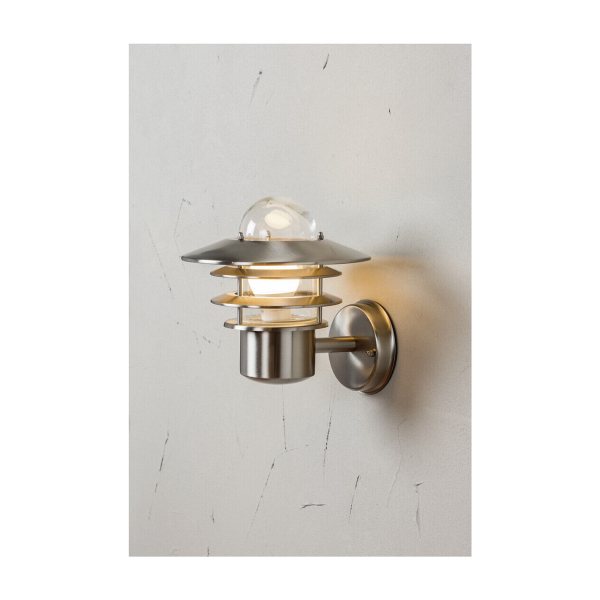 Klassinen ja ajaton seinävalaisin, joka sopii esim. terassille tai pihapiirin valaisuun. Saatavilla teräksisenä, mustana tai valkoisena, polttimon kanta E27 (ei sis.).