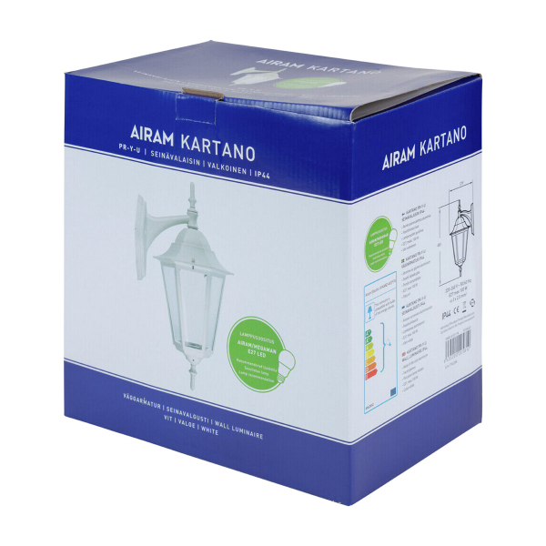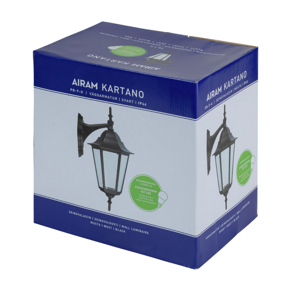 Airam Kartano Down on nykyaikainen versio vanhanajan lyhtyvalaisimesta, joka sopii perinteiseen pientalomiljööseen. Vanhanajan lyhtyvalaisimen muoto tekee valaistuksesta tunnelmallista, ja sen laadukkaat materiaalit kestävät sekä aikaa että sään tuomaa rasitusta. Valaisimessa on fasettihiotut lasit, alumiininen runko ja posliininen lampunpidin. Suojaluokitukseltaan Airam Kartano Down on IP44-standardin mukaan vesi- ja pölytiivis. Airam Kartano Down toimii yhdellä E27-polttimolla (ei sisälly pakkaukseen). Down-mallissa valonlähde on suunnattu alaspäin, ja lampun muoto näkyy selkeästi lasien läpi, joten lamppuvalinnalla voi oleellisesti vaikuttaa valaistuksen tunnelmaan ja tehoon (maks. LED-polttimon teho 11W).
