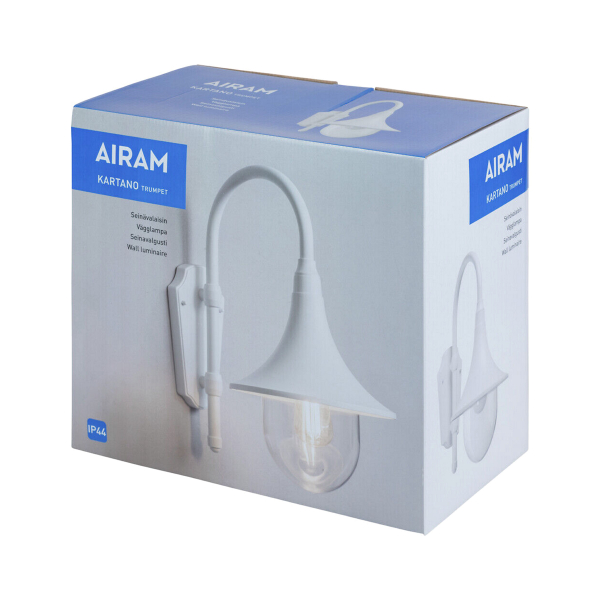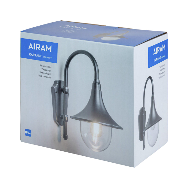 Airam Kartano Trumpet on pinta-asennettava seinävalaisin, jonka klassinen muotoilu sopii niin vanhemman kuin modernimman talon ulkoasuun. Se on pelkistetympi versio vanhanajan lyhtyvalaisimesta, jonka laadukkaat materiaalit kestävät sekä aikaa että sään tuomaa rasitusta. Valaisimen runko on alumiinia ja kupu polykarbonaattia, suojaluokitukseltaan Airam Kartano Trumpet on IP44-standardin mukaan vesi- ja pölytiivis. Airam Kartano Trumpet toimii yhdellä E27-polttimolla (ei sisälly pakkaukseen). Lampun muoto näkyy selkeästi kuvun sisältä, joten lamppuvalinnalla voi oleellisesti vaikuttaa valaistuksen tunnelmaan ja tehoon (maks. LED-polttimon teho 11W).